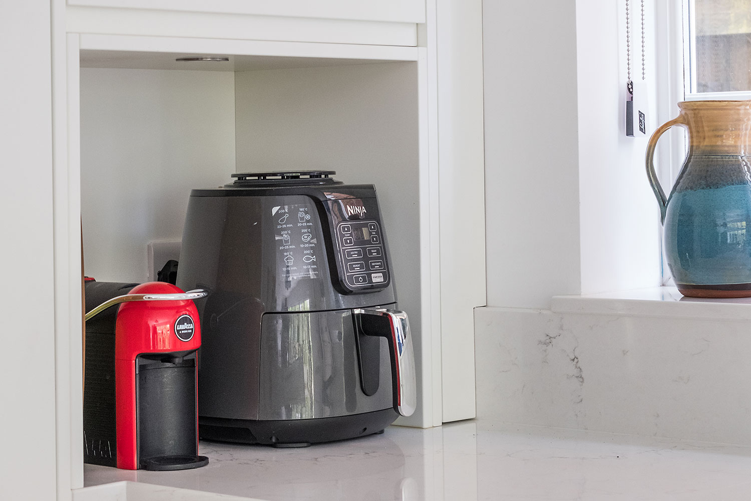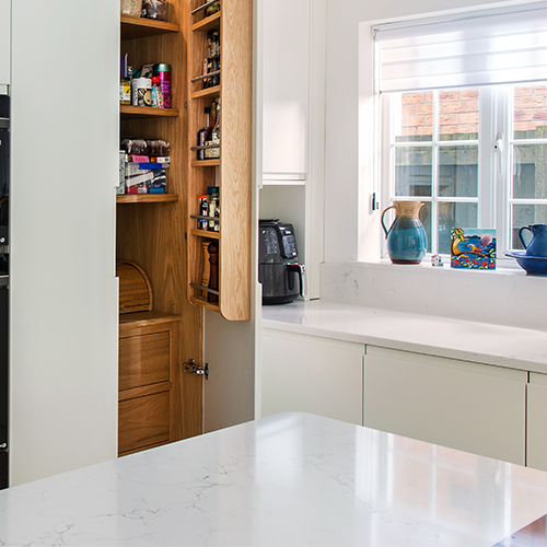 Our designer Alec Yull listened carefully as Rachel and Keith described their vision and detailed what they wanted from their new kitchen. He quickly picked up on another key requirement; well-designed storage for crockery, glassware and cooking equipment. Rachel and Keith were taken with his suggestions of a useful carousel fitting to maximise otherwise-wasted corner cupboard space, and a freestanding island packed with sturdy, easy-access drawers. They appreciated smaller, thoughtful design touches too, like the work top ‘appliance garage’, a neat cubby-hole complete with wall-sockets, which houses the air-fryer and coffee-maker. There are separate bins to help sort recycling, and a practical metal base for standing cleaning products in the under-sink cupboard. Another plus point was that Stoneham offers a wide range of sizes, including extra-tall wall units,