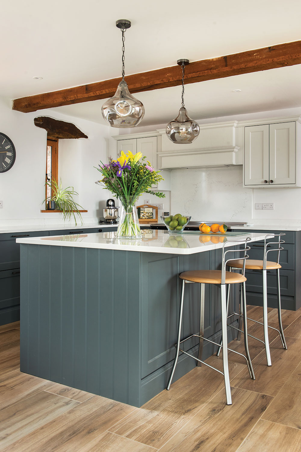 Mark and Val have lived in their beautiful, converted eighteenth-century barn for over twenty-five years. When their oak kitchen finally came to the end of its life, they decided to knock through and remodel the adjoining space at the same time as replacing it. This would create seating with a garden view, and a separate utility room.