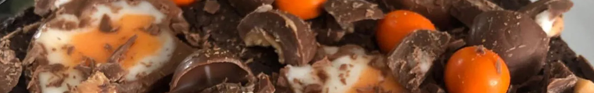 While the brownies are cooling, chop five crème eggs in half and roughly chop some mini chocolate eggs.