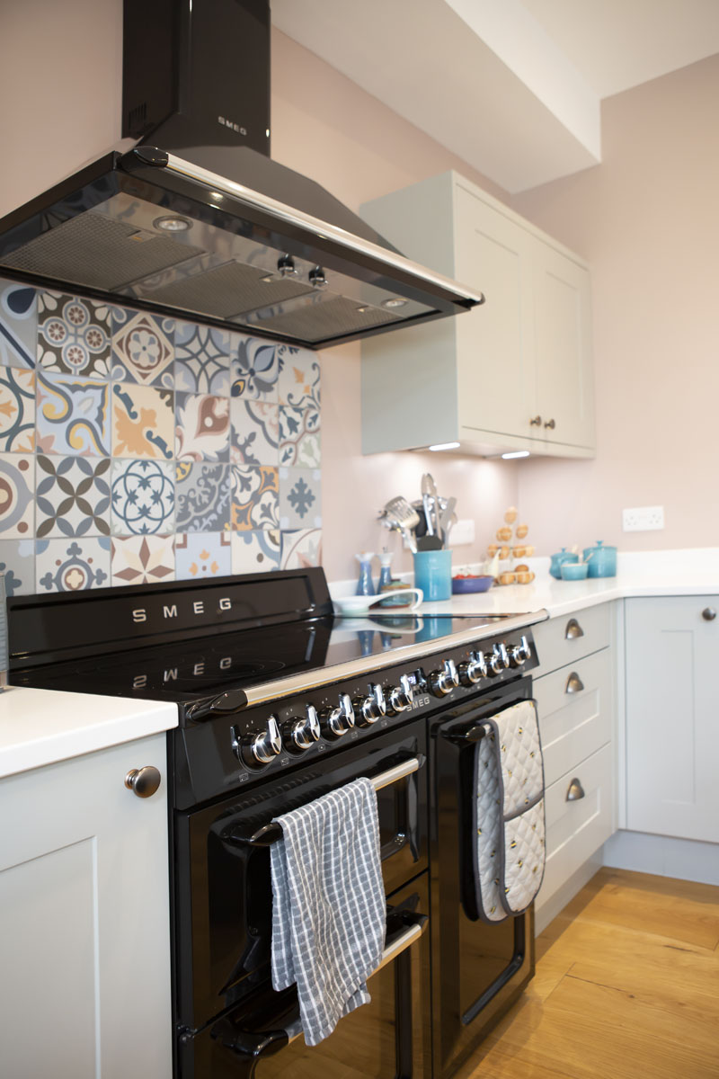 Soft, pale blue porcelain tiles running the length of a kitchen wall can create a subtle yet striking effect. The gentle colour adds character without overpowering the overall design, while the texture and pattern of tiles introduce visual interest.