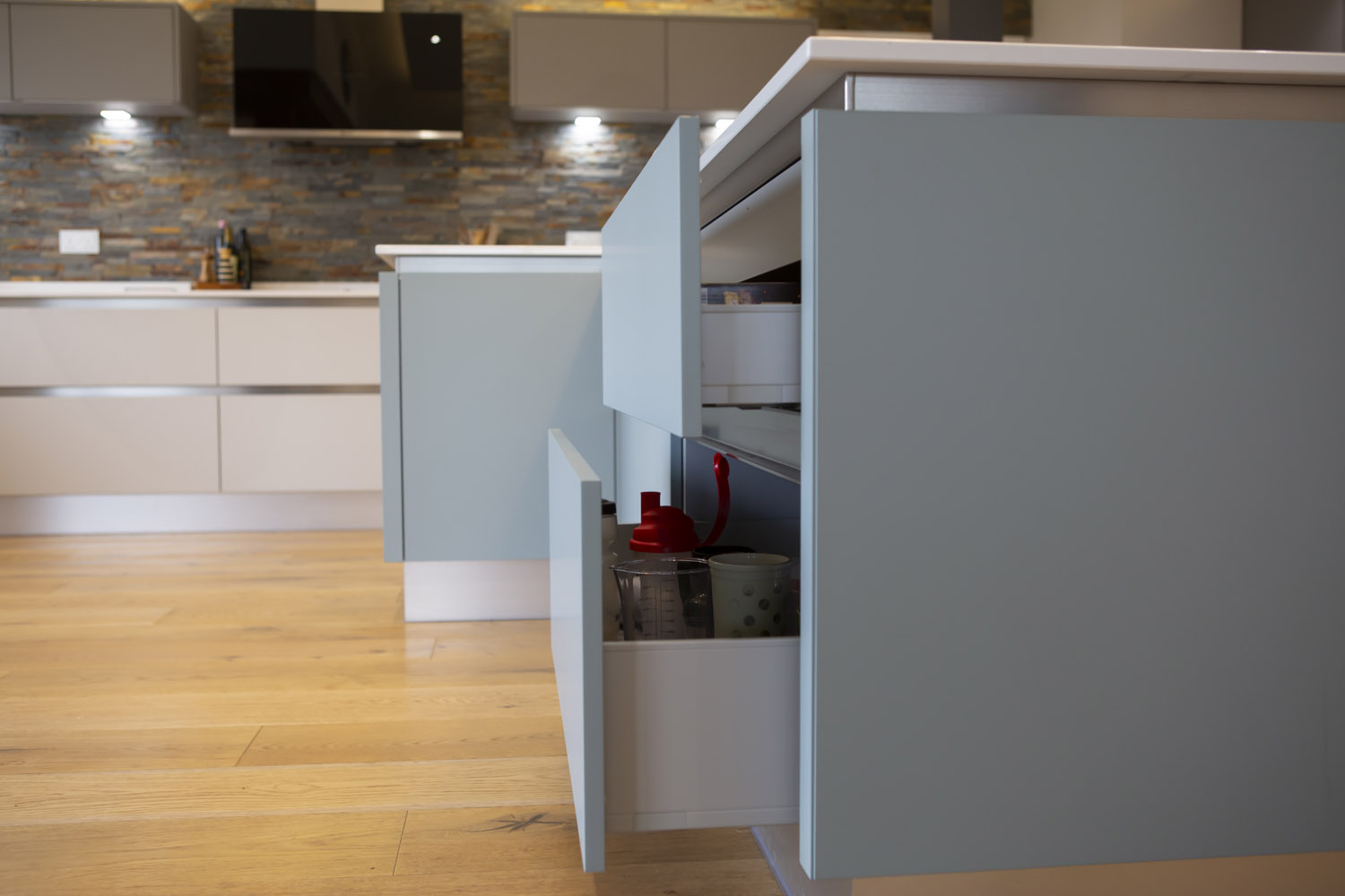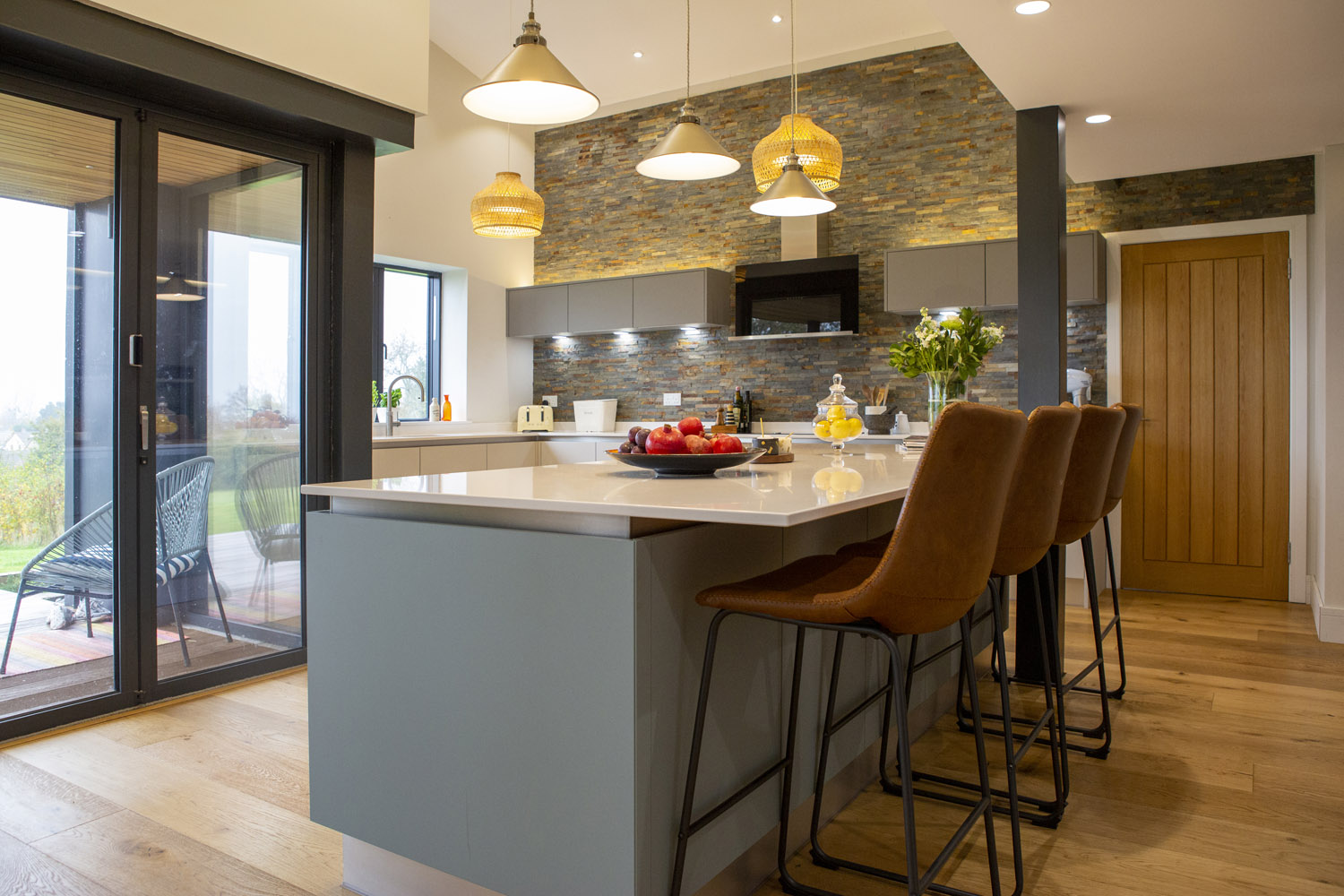 The newly modernised Crown Imperial handle-less kitchen sits beautifully at the rear of the property with amazing views of the countryside beyond. Originally, Wayne and Jane lived in the farmhouse next door to the barn conversion and Jane loved the farmhouse shaker kitchen style with the Aga. So, when they decided to purchase the barn and renovate it, she always thought she would go for the traditional farmhouse style kitchen again. A visit to a friend’s house with a modern kitchen style also from Gardiner Haskins made her think a little differently. They had fallen in love with the modern style. One trip later to the showroom to see Alec the kitchen designer, they were convinced that a modern style kitchen would work well. When Alec came to the house to measure up, there was nothing but a complete blank canvas and shell for the kitchen. He could see the front of the house taking shape and recommended a modern kitchen in keeping with the modern design of the renovation. Our designers love a challenge like this!