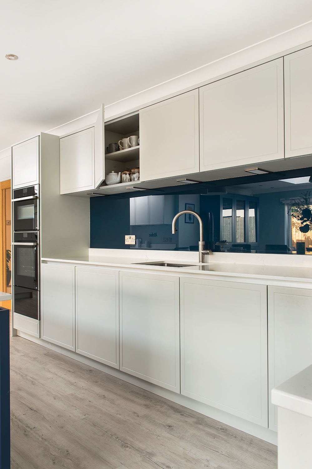 Roz was looking for flat, wipeable doors, with no dust-traps, and browsing the displays, she picked out Stoneham’s Latitude furniture, which ticked the boxes for smart looks, flexibility and fuss-free maintenance. The tall larder unit, with its easy-to-use, glass-sided drawer storage particularly caught her eye. A bold blue island and seamless glass splashback were brought together with subtle pale grey wall-units, and white-and-grey, marble-look quartz work surfaces, all of which struck the right note too.