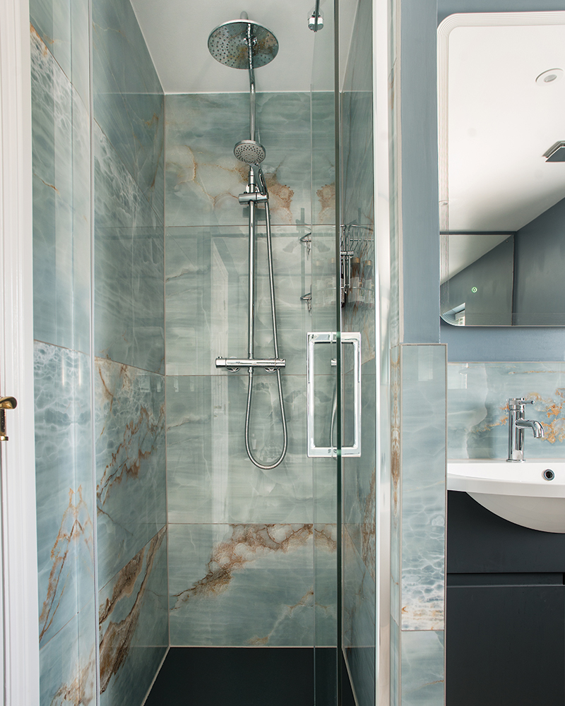 Olga’s designs were focussed on addressing all the issues Natalie and Andrew raised. The bathrooms have been updated with stylish, large-format wall tiles, minimising grout-lines and maximising colour and impact. For each room, she sourced a low-level shower-tray, creating a near-seamless feel. She suggested large, drencher shower heads, and neat, smooth action sliding shower doors that do not jut into the rooms. The noisy, electric shower pumps were replaced by a new pressurised hot water system, boosting water-pressure throughout the house and delivering a powerful shower. Around the hand-basins space-enhancing, built-in storage conceals charging points for toothbrushes and shavers, and keeps surfaces clutter-free.