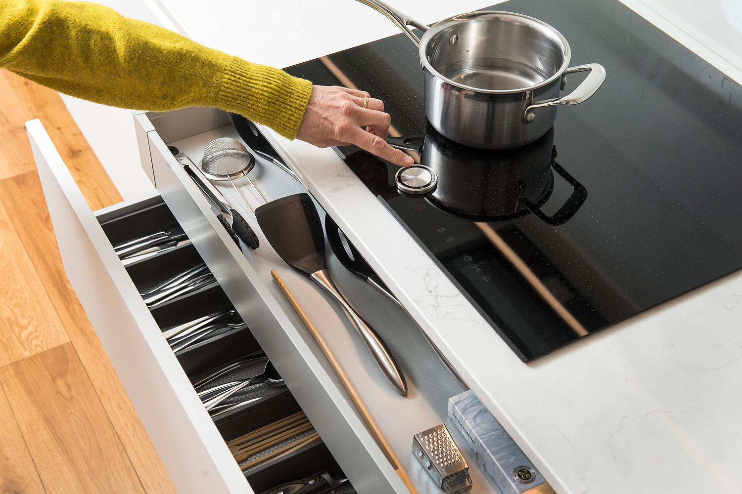 A small light-well above the sink draws some daylight from the upper floor, but extra ceiling spots have been added, as well as remote-controlled lighting above and below the wall units, and beneath the work surfaces. The stylish glow can be adjusted for a warmer or cooler effect, giving practical task lighting, or a softer mood for evening entertaining. Seamless, easy-clean white glass splashbacks bounce the light around too.