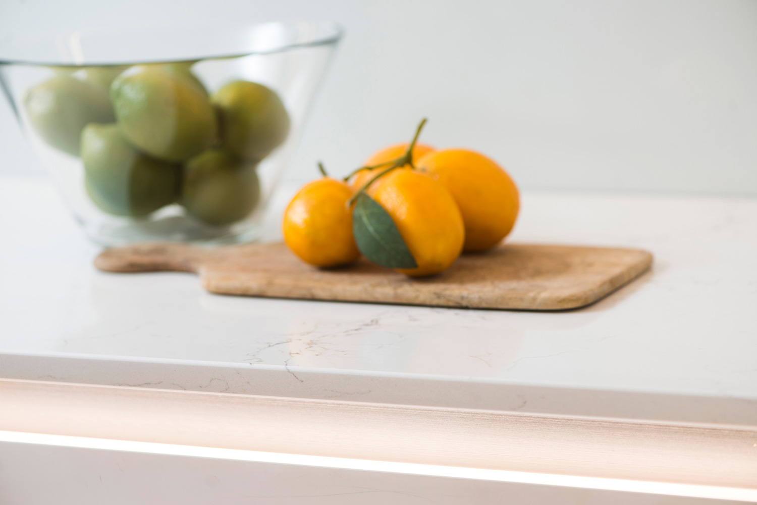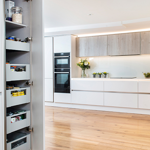 Gina and Roy had several other ‘must-haves’. Gina loves minimal, modern style, crisp lines and clutter-free surfaces, while Roy wanted a well-appointed bar area to produce a ‘wow’ moment for guests. They approached Gardiner Haskins, noticing the company offers Stoneham Kitchens, which they recognised as a quality brand. For comparison, they looked at another kitchen showroom too, but meeting our designer Alec, they quickly felt relaxed, and impressed by his expertise and creativity,