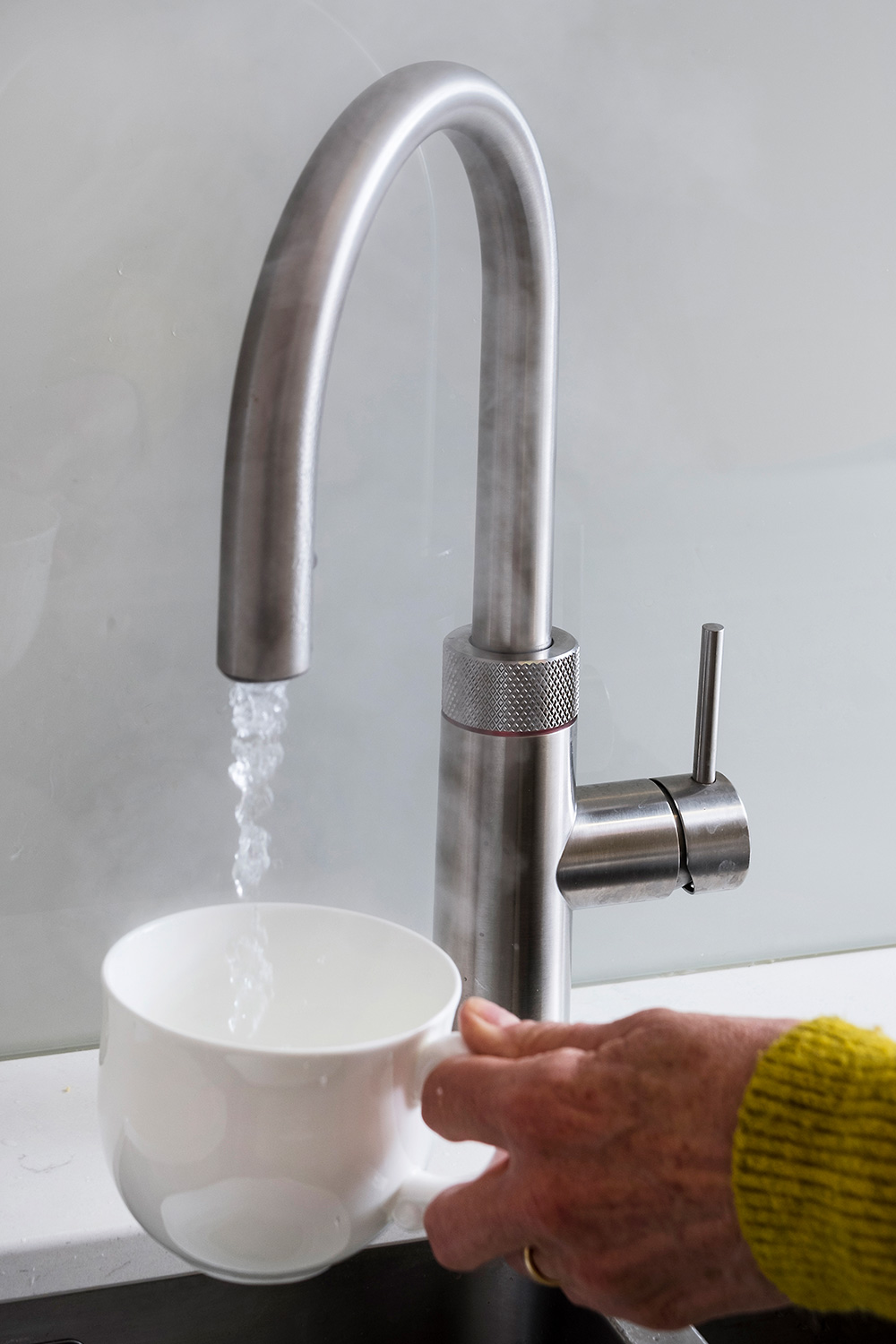 Gina knew she did not want a large extractor hood that might dominate the space, so Alec found a brilliant solution, concealing the extractor in a wall-cabinet above the hob. Tucked beneath, the touch-activated, flip-down, glass control panel is super-neat. The Quooker boiling water tap is another favourite gadget. Gina admits she was a little nervous of it at first, but now she is used to how it works, and absolutely loves its speed, convenience and the added bonus of a kettle-free surface.