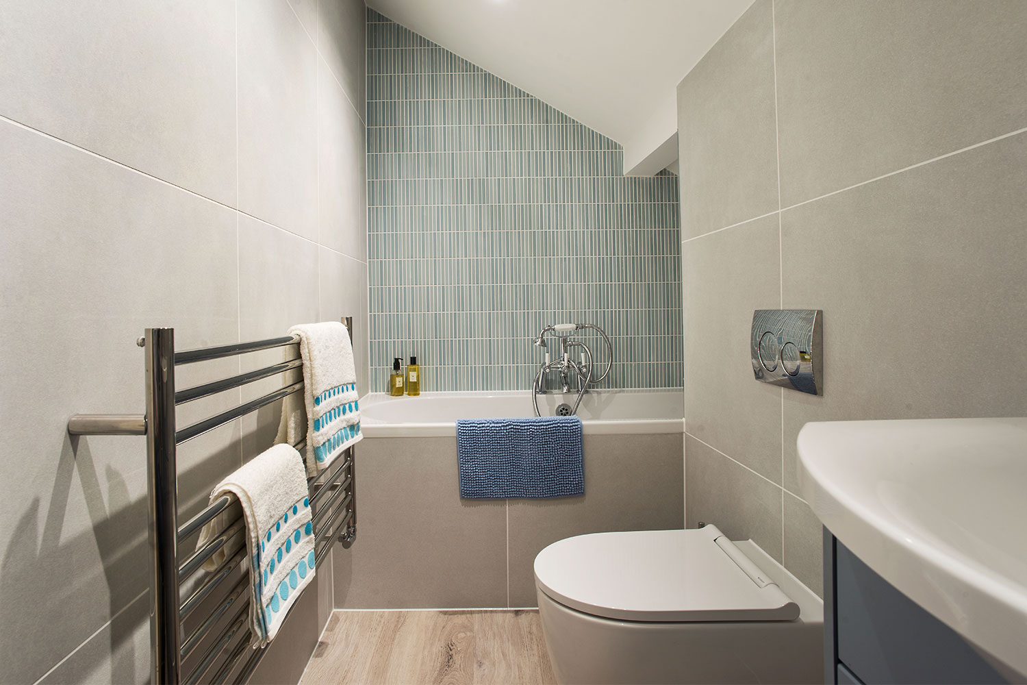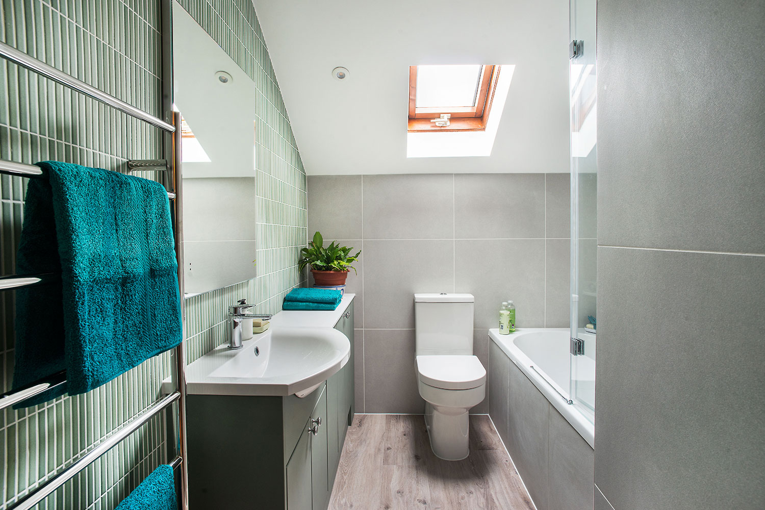 As both bathrooms are quite compact and have slanting ceilings, there was little scope for changing the layouts. After listening to Iain and Billie’s requirements, Daisy focussed on making them more comfortable and enjoyable to use, giving each room a fresh, modern feel and improving showering and storage options. For continuity and simplicity, she proposed similar or matching products in both rooms, but with an injection of blue tones in the ensuite, and greens in the family bathroom to give each a distinct personality.
