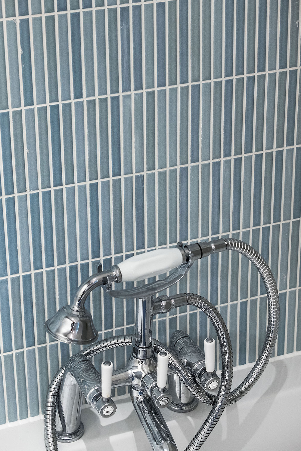 Billie was keen to minimise dust-traps, so the bath sides are completely tiled to match the walls, and pipework behind the WCs is concealed. Another ‘must-have’ was a more powerful shower in the family bathroom, and Daisy sourced a large, fixed drencher showerhead combined with a smaller hand-held spray, useful for rinsing the bath. The old shower-curtain has been replaced by a nifty glass screen that folds vertically in half when not in use, helping the space feel more open and inviting.