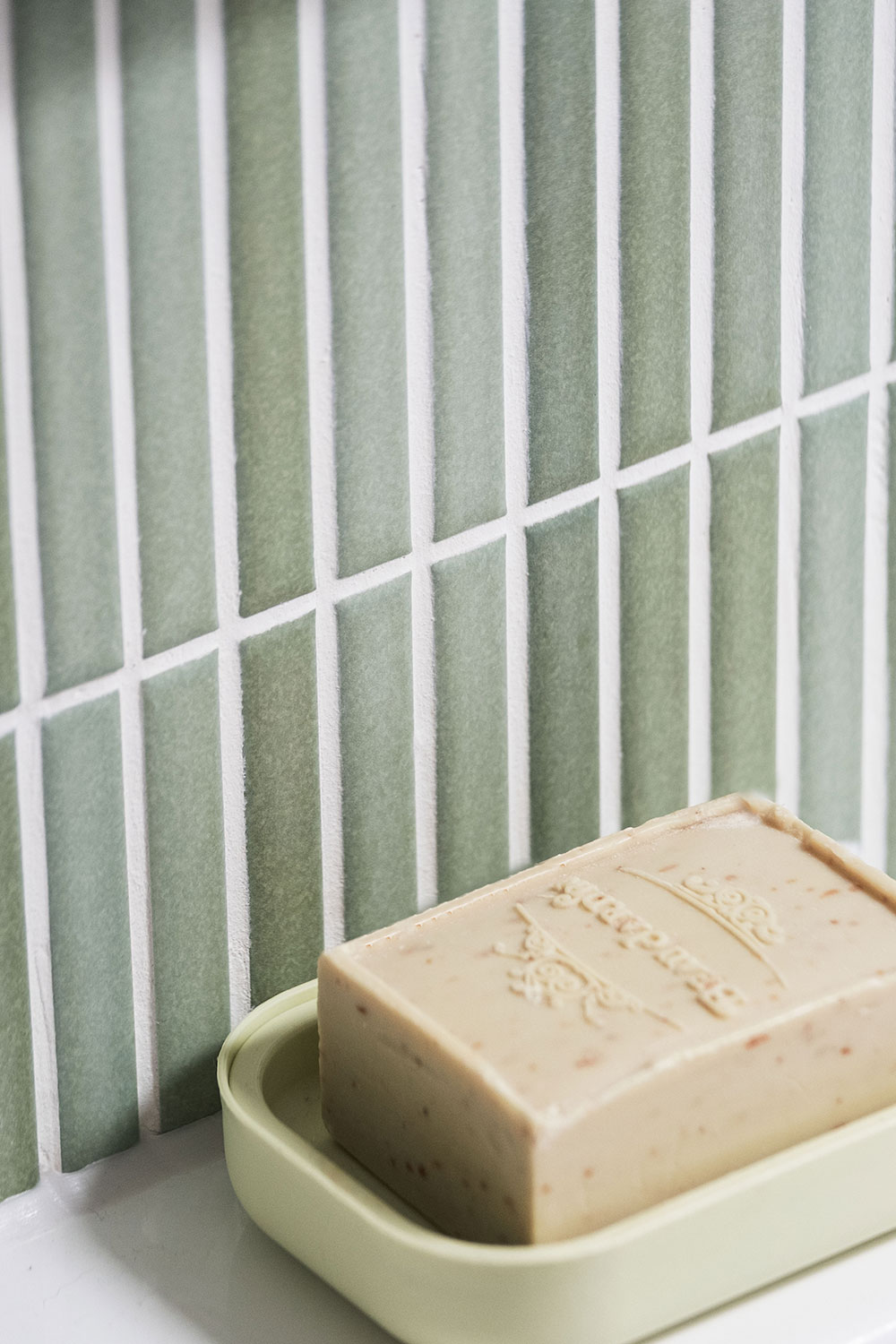 Poor storage meant both bathrooms had suffered from cluttered surfaces, with eye-level shelves and a cabinet adding to the cramped feel. For a more streamlined effect, Billie wanted built-in furniture below an integrated handbasin. She and Iain chose mid-blue cabinetry for the ensuite, and deep green for the family bathroom. In both rooms, the colour breaks up the mid-grey walls, and is echoed in a fully-tiled feature wall that lends interest and texture to each bathroom,