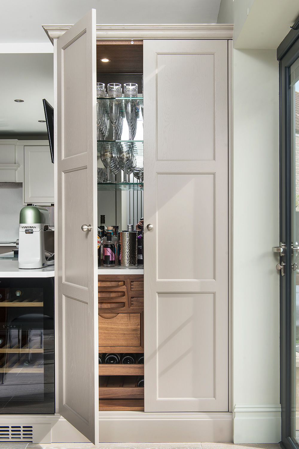 Selina and Carmelo chose smart, modern appliances and Stoneham’s classic Cudham cabinetry, in two subtle neutral colours. In the centre is a large freestanding island. The pantry, complete with walnut drawers personalised with the family name, anchors one end of an L-shaped run of wall-units. At the other end, the bar and wine-cooler face towards the dining table. There is also a dedicated drinks fridge on the outer side of the island, and the three together create a stylish dining and entertaining zone, distinct from the cooking area,