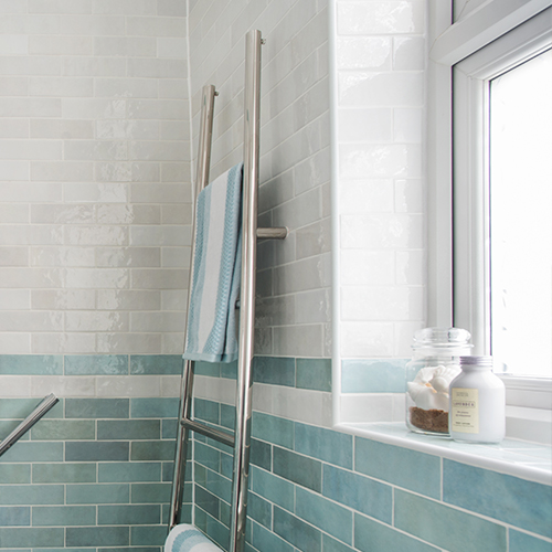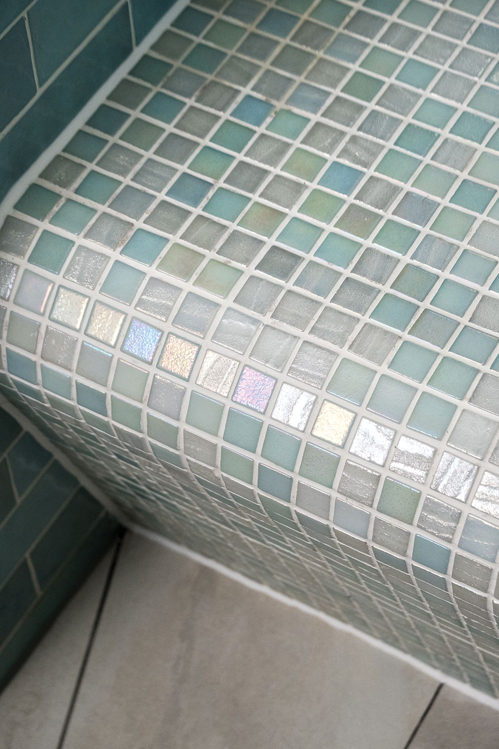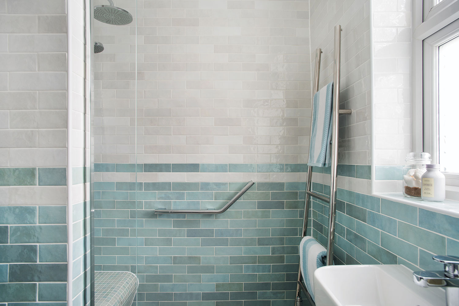 All walls but one have been fully tiled. The couple chose a mix of timeless off-white and blue-green metro tiles, boosting natural light and giving the bathroom an airy, coastal vibe. For contrast, the curved shower seat is clad in shimmering aquamarine mosaics,