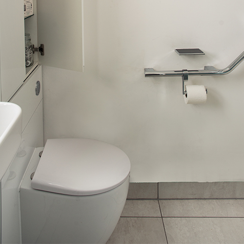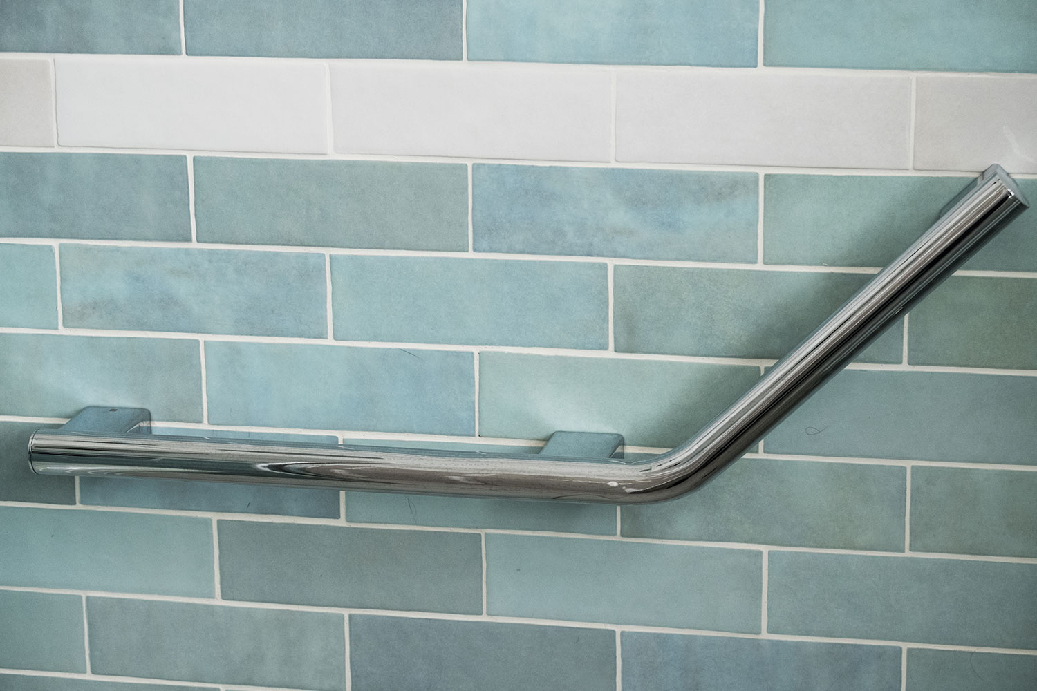 As part of the future-proofing of the bathroom, grab rails have been fitted in the shower and beside the WC. David quickly understood Cheryl’s wish to avoid unsightly fittings, and was able to suggest some well-designed chrome rails that blend seamlessly with the other metal elements,