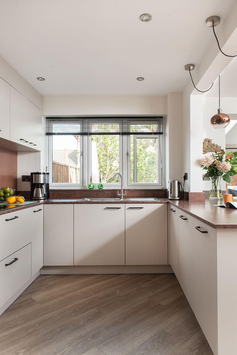 Keen to keep their kitchen low-maintenance, Naomi and Jonathan chose plain, flat, easy-wipe doors in a warm, neutral shade. They specified a wood-effect finish inside the cabinets, but requested that the underside of the wall-units matched the doors, and that the integrated lighting did not protrude. Zoe’s attention to detail ensured all their must-haves were met, and they were impressed with the care taken, and high standard of fitting achieved by our recommended installer. Bronze-toned laminate work tops and pinkish-brown glass splashbacks emphasise an inviting feel,