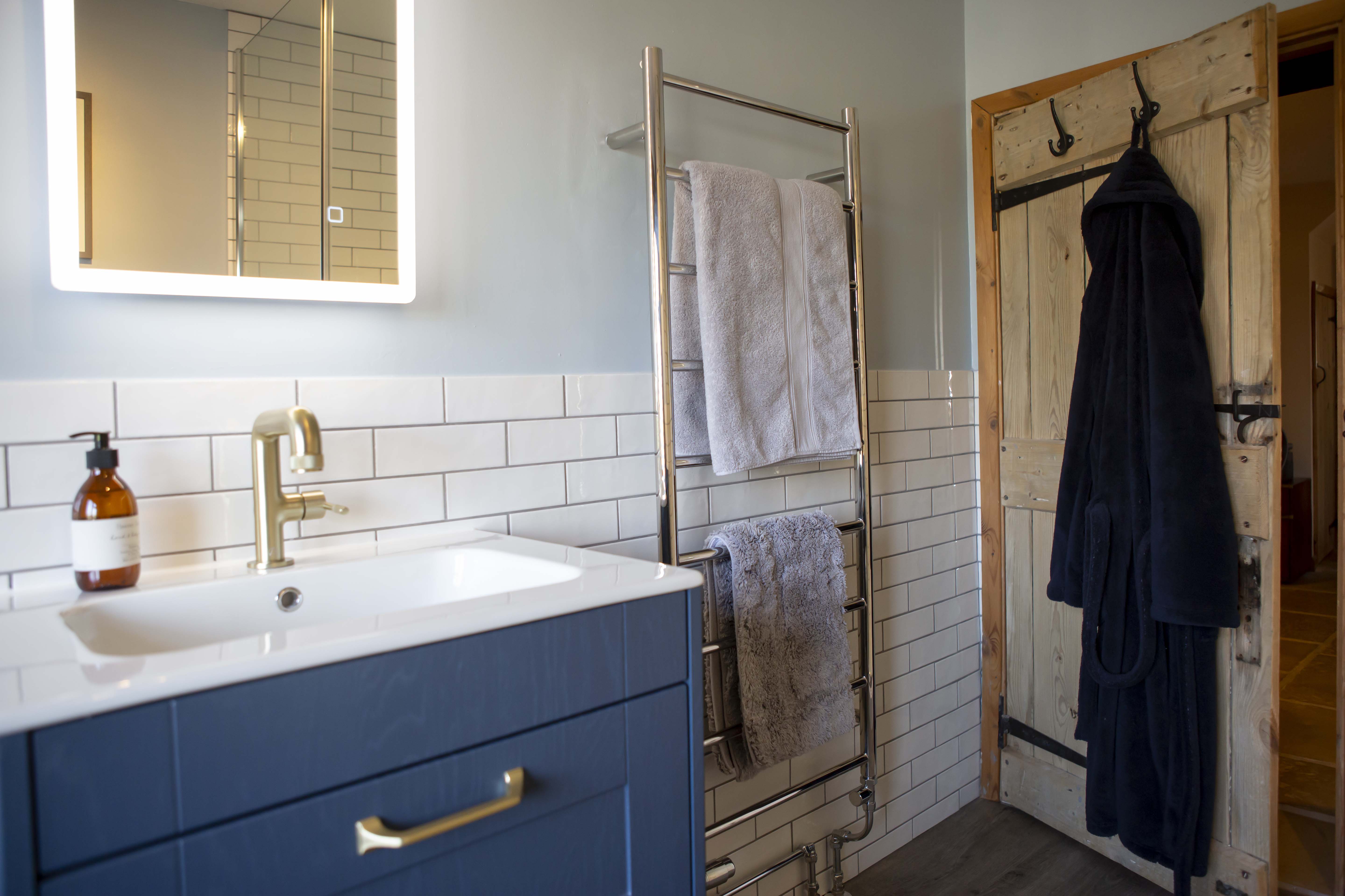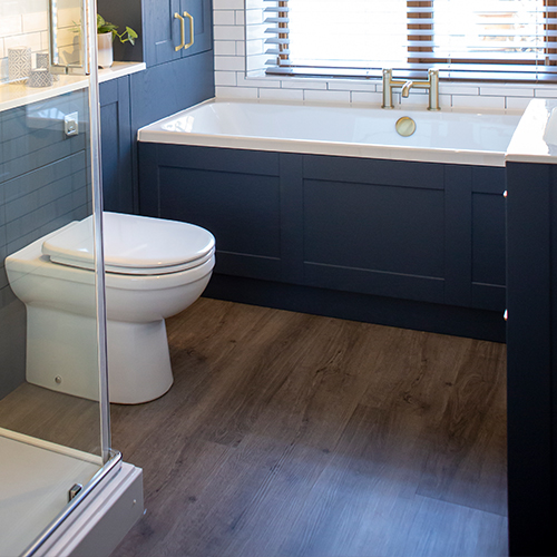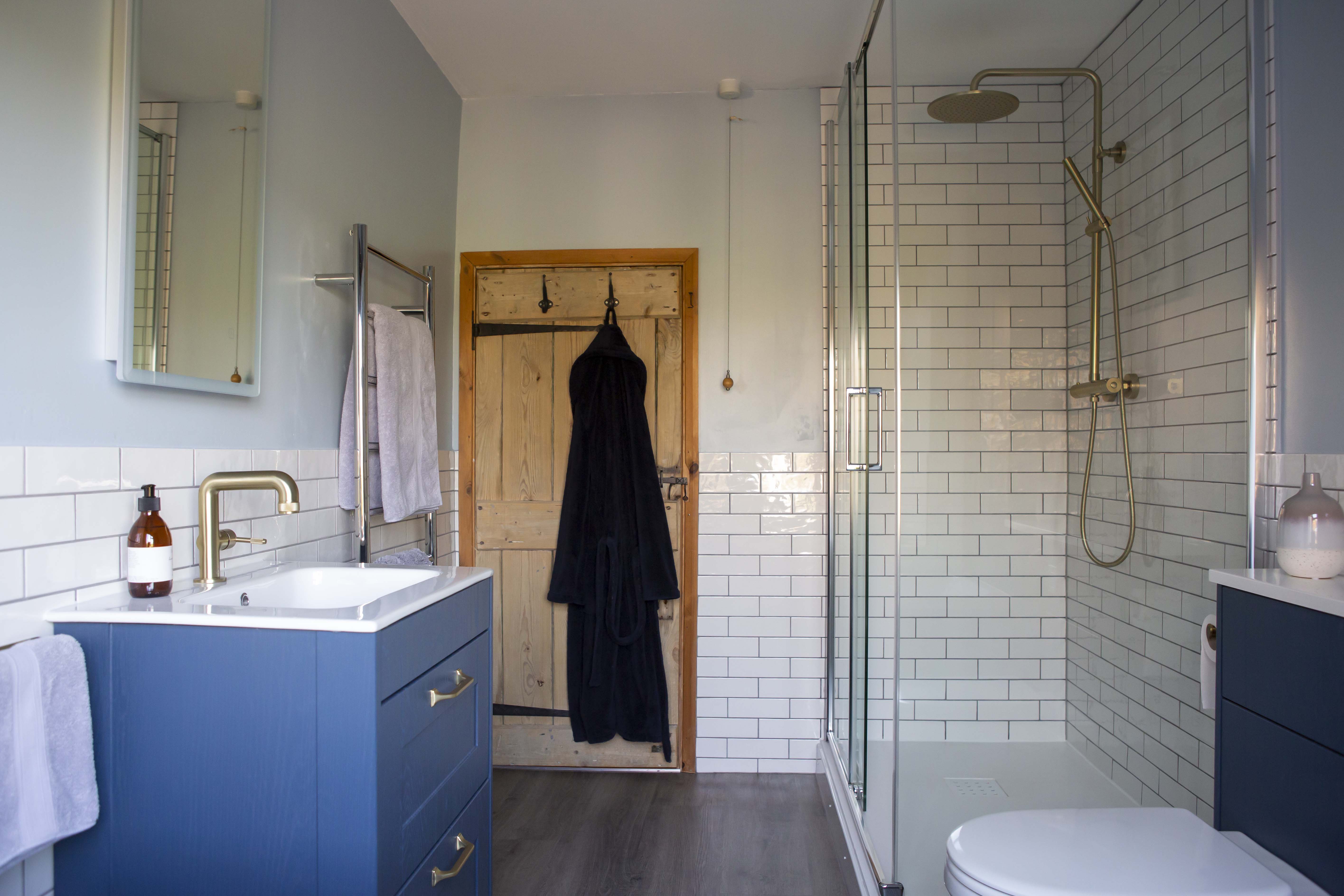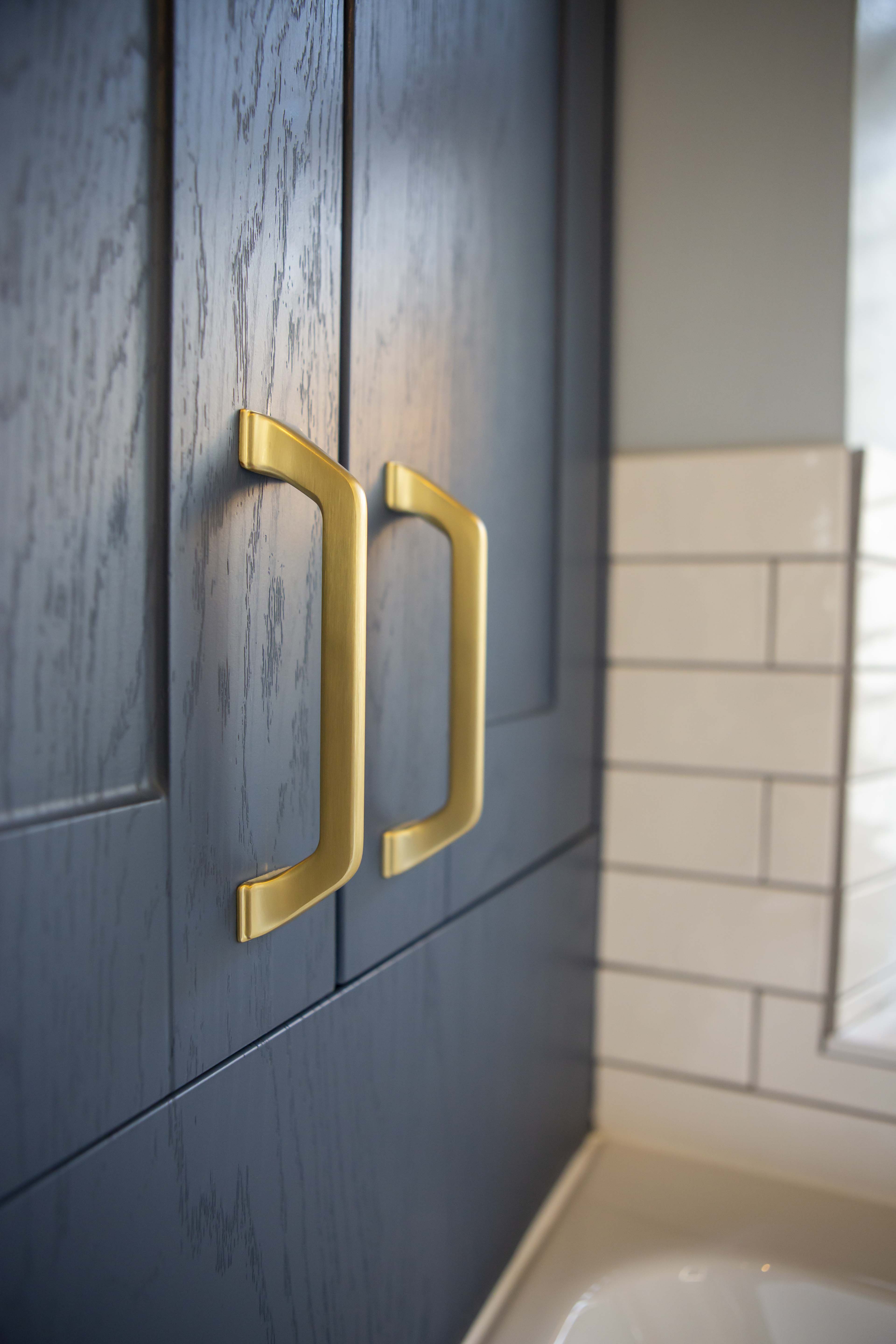 Having a clear idea of the colour scheme for the bathroom even down to the flooring, tiles and bathroom cabinets, Rod required assistance with putting all his ideas down into a bathroom plan. David, one of our bathroom designers helped Rod decide on the brassware, furniture and other important details that shaped the bathroom design. Rod included on his wish list a tall cabinet, which he wanted somewhere in the room but couldn’t work out how this would fit. Slimline bathroom cabinet units made all the difference to the bathroom space enabling Rod to have his tall bathroom unit behind the repositioned bath. The bathroom taps were also moved so that the bath now sits with perfect views of the countryside beyond. With David’s assistance, stunning brass tap and shower fittings along with WC and towel holder fittings adorn the bathroom complimenting the deep, blue cabinetry beautifully. There is also plenty of other storage in the bathroom cabinet underneath the sink unit.