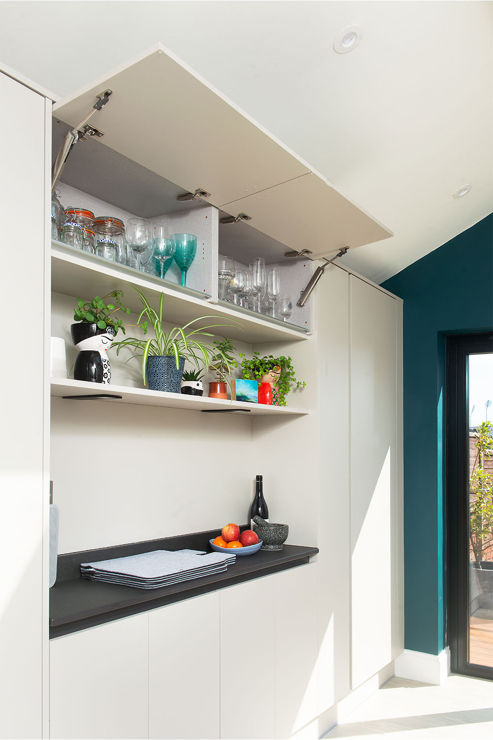 “She immediately spotted that the dining end of the room could be made wider and more user-friendly just by reducing the depth of the wall cabinets,” says Jacqui, “Although they’re now shallower, they’re so cleverly-designed that we actually have more storage than before, as well as display space for accessories.”